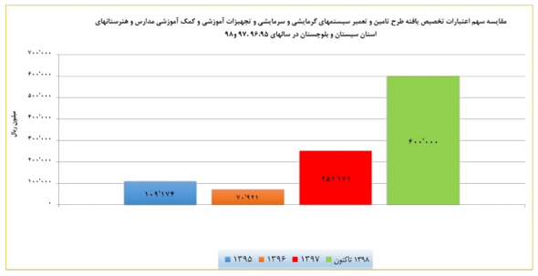 موضوع دیگری که در این گزارش به آن اشاره شده است، غیراستاندارد بودن سیستم گرمایشی برخی مدارس این استان است که عنوان شده است؛ "سال گذشته ۳ دانشآموز دختر در اثر غیراستاندارد بودن وسایل گرمایشی در این استان جان خود را از دست دادند و مدارس فرسوده و غیراستاندارد یا مدارس خشت و گلی نیز همچنان در این استان به کار خود ادامه میدهند. " حال آنکه غیراستاندارد بودن سیستم گرمایشی یک مدرسه غیردولتی که حتی از ادارهکل نوسازی مدارس و آموزش و پرورش استان مجوز نداشته است، با فرسوده بودن مدارس خشتی و گلی دو موضوع کاملاً متفاوت است و ربطی به هم ندارد! این در حالیست که سازمان نوسازی مدارس کشور تلاش نموده تا رشد قابل توجهی در اعتبارات ویژه استاندارد سازی سیستمهای گرمایشی و سرمایشی استان سیستان و بلوچستان نماید تا شاهد این چنین حوادثی در مدارس نباشیم، گواه رشد اعتبارات این استان در این زمینه، نمودار اعتباراتی است که سازمان برنامه و بودجه کشور طی سالهای ۹۵، ۹۶، ۹۷ و ۹۸ به این سازمان تخصیص داده است و سهم استان در آن مشخص است: