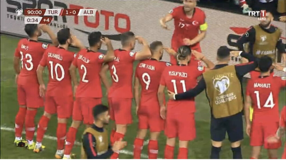 اعضای تیم ملی فوتبال ترکیه بعد از گل اول در بازی با آلبانی در مسابقات انتخابی جام جهانی رو به دوربینها سلام نظامی دادند.