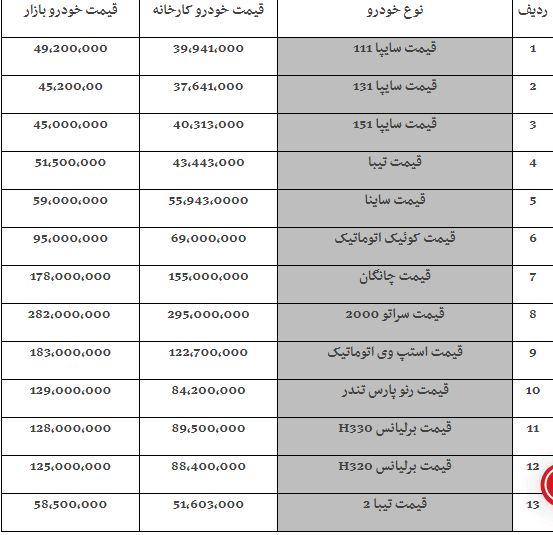 خودرو پراید ۱۳۱ با قیمت ۴۵میلیون و ۲۰۰ هزار تومان، چانگان با قیمت ۱۷۸ میلیون تومان، استپوی با قیمت ۱۸۳میلیون تومان، سراتو با قیمت ۲۸۲میلیون تومان و تیبا با قیمت ۵۱میلیون و ۵۰۰ هزار تومان مورد معامله قرار گرفت.