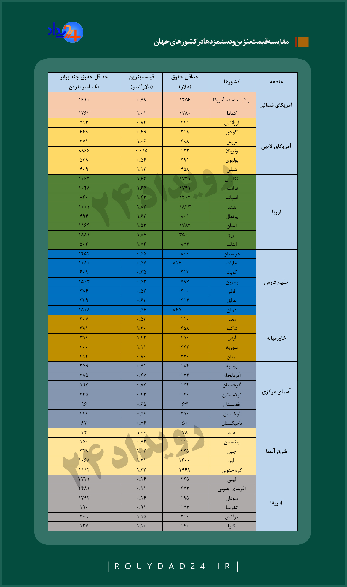 نسبت قیمت بنزین به حداقل حقوق مردم جهان چقدر است؟ +جدول