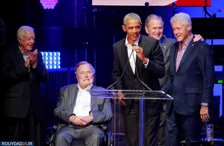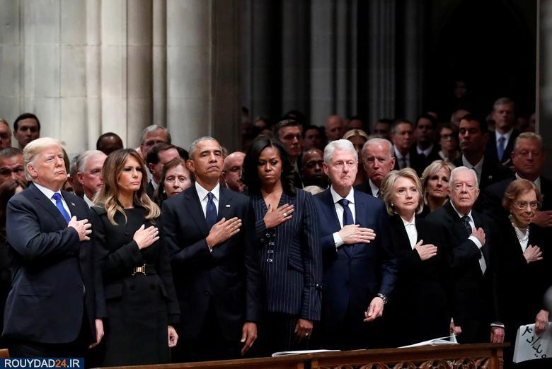 از چپ دونالد ترامپ ملانیا ترامپ باراک اوباما رییس جمهور پیشین میشل اوباما اولین همسر سابق باراک اوباما رییس جمهور سابق بیل کلینتون هیلاری کلینتون سیاستمدار جیمی کارتر رییس جمهور پیشین و روزالین کارتر در مراسم تدفین جرج بوش پدر.
