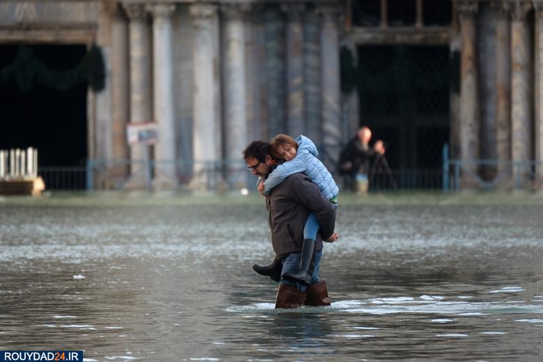 مردی در میدان سن مارکو ونیز کودکی را از سیلاب خارج میکند
