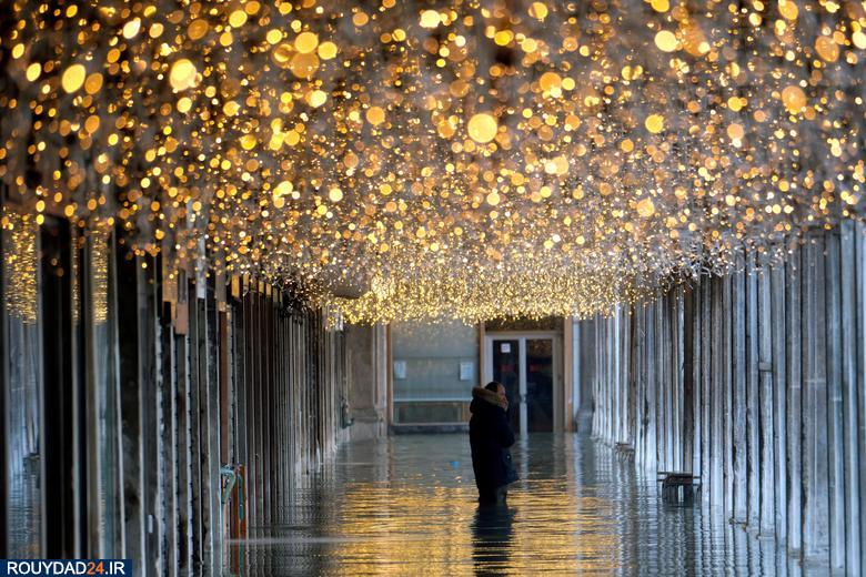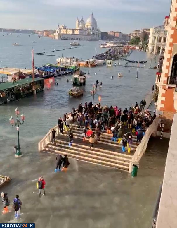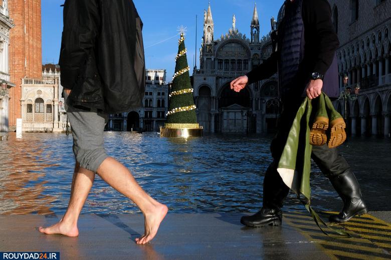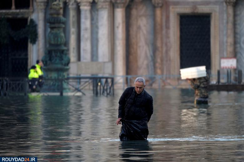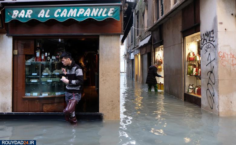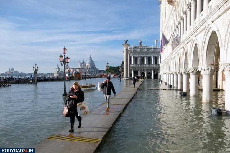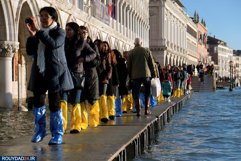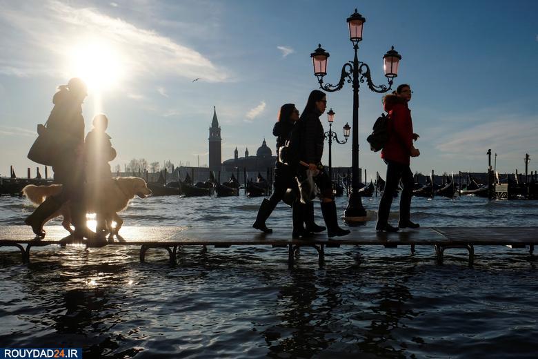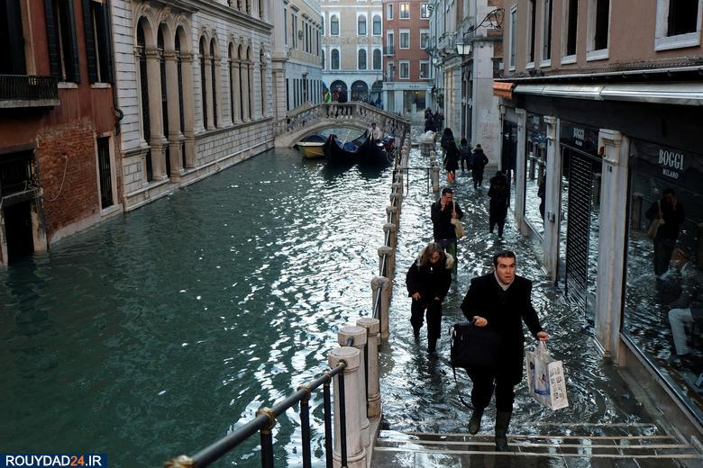 مردم ونیز در خیابانهای سیل زده در آب راه میروند