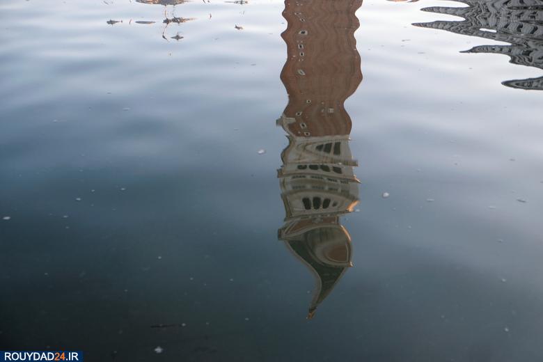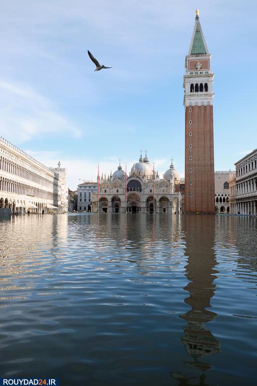 نمایی از برج ساعت در سیلاب میدان سن مارکو شهر ونیز