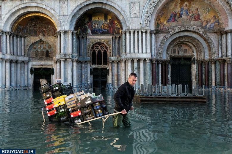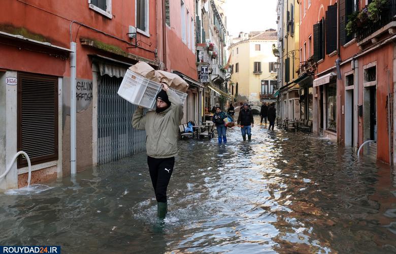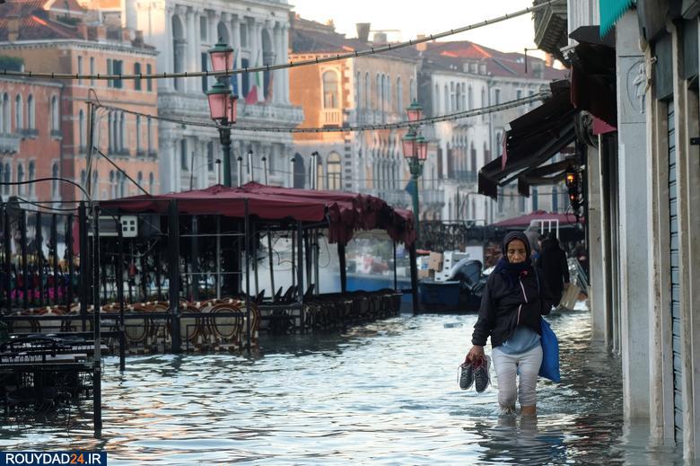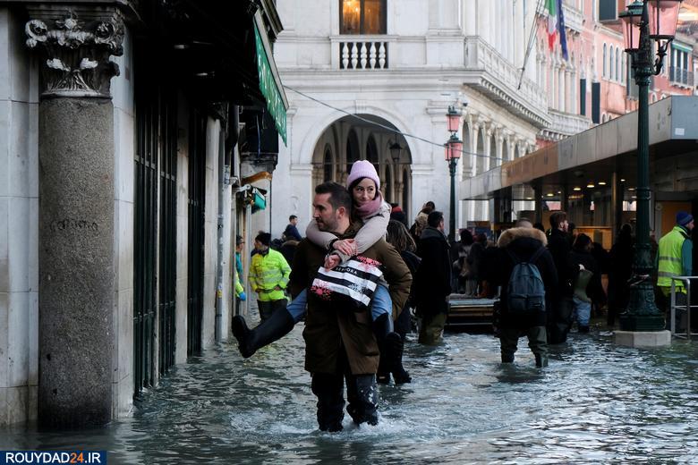 مردی در جریان سیل شدید ونیز زنی را بر دوش میکشد .