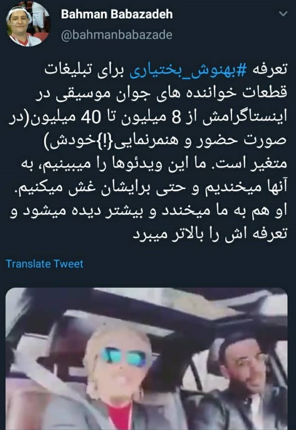 رویداد۲۴ بهمن بابازاده خبرنگار حوزه هنر و موسیقی با انتشار ویدئویی از بهنوش بختیاری نوشت:تعرفه بهنوش بختیاری برای تبلیغات قطعات خوانندههای جوان موسیقی در اینستاگرامش از ۸ میلیون تا ۴۰ میلیون (در صورت حضور و هنمرنمایی{! }خودش) متغیر است. ما این ویدئوها را میبینیم، به آنها میخندیم و حتی برایشان غش میکنیم. او هم به ما میخندد و بیشتر دیده میشود و تعرفه اش را بالاتر میبرد.