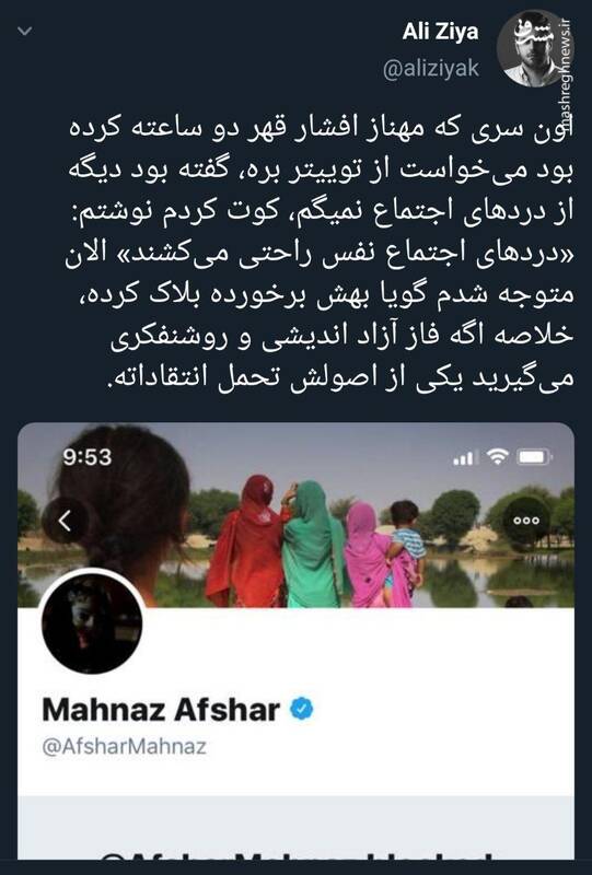 رویداد۲۴ علی ضیا در واکنش به بلاک شدنش توسط مهناز افشار در صفحه شخصی خود در توییتر نوشت: اون سری که مهناز افشار قهر دو ساعته کرده بود میخواست از توئیتر بره، گفته بود دیگه از دردهای اجتماع نمیگم.
