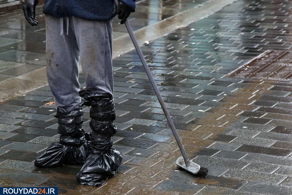 مردی در طوفان دنیز بریتانیا پاهایش را با پلاستیک زباله پیچیده و خیابان را پاک میکند