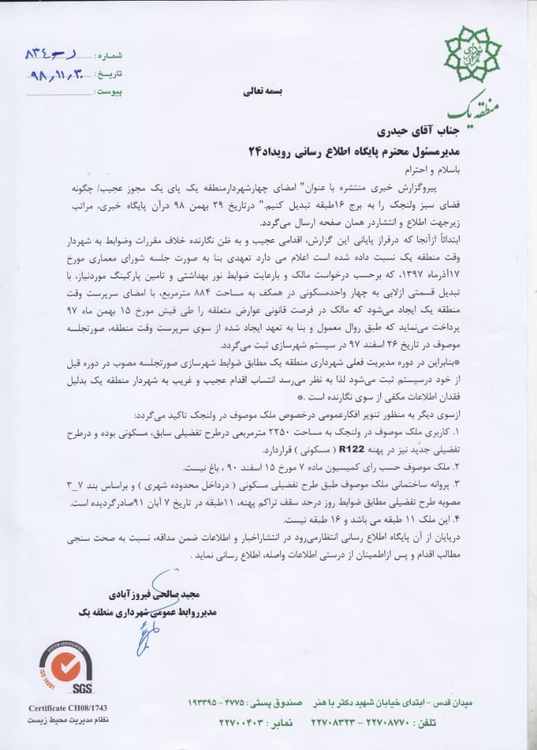 پیرو انتشار گزارشی با عنوان"امضای چهار شهردار منطقه یک، پای یک مجوز عجیب/ چگونه فضای سبز ولنجک را به برج ۱۶ طبقه تبدیل کنیم؟ +اسناد و عکس" در رویداد ۲۴ روابط عمومی شهرداری منطقه یک تهران جوابیهای ارسال کرده است.