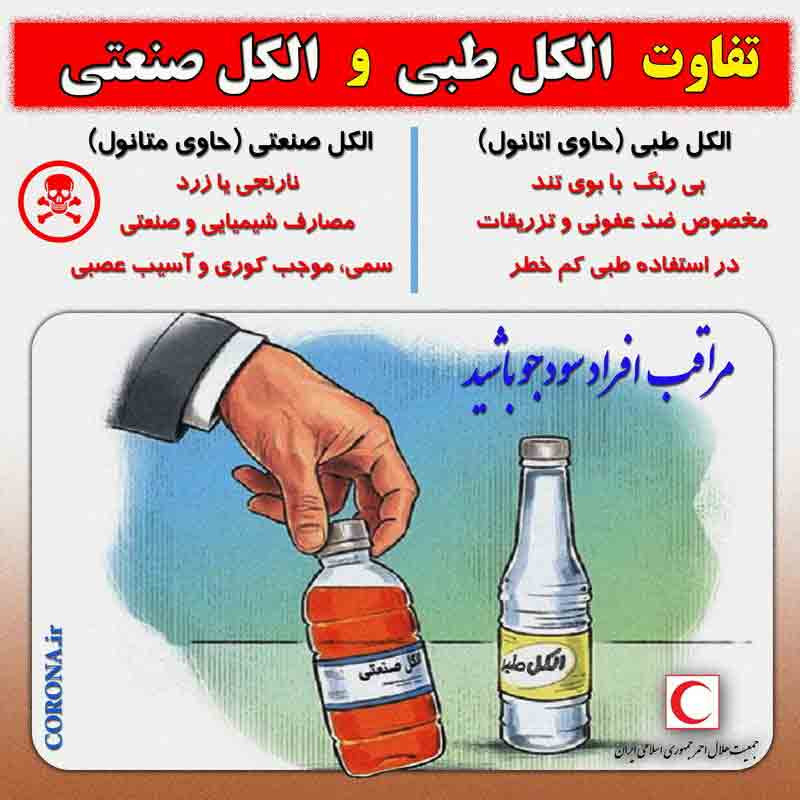 ۲- قدرت ضدعفونی کنندگی متانول (الکل صنعتی) نسبت به اتانول کمتر است؛ بنابراین استفاده از آن فایده زیادی نخواهد داشت.