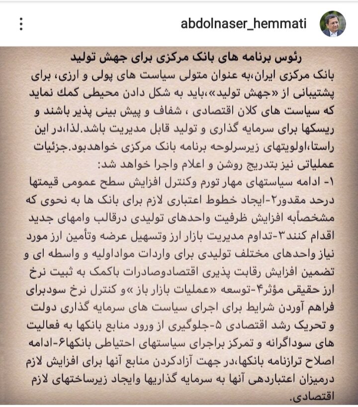 رویداد۲۴ عبدالناصر همتی در آخرین یادداشت خود در اینستاگرام تاکید کرده است که بانک مرکزی ایران، به عنوان متولی سیاستهای پولی و ارزی، برای پشتیبانی از «جهش تولید»، باید به شکل دادن محیطی کمک نماید که سیاستهای کلان اقتصادی، شفاف و پیش بینی پذیر باشند و ریسکها برای سرمایه گذاری و تولید قابل مدیریت باشد.