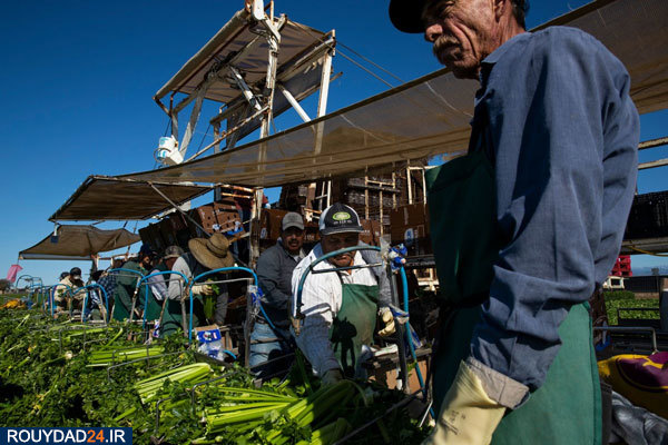 کالیفرنیا، ۲۶ مارس ۲۰۲۰، کارگران مزرعه در فصل برداشت کرفس، آنها کرفس را هم برای آمریکاییها و هم به منظور صادر کردن آماده کردهاند