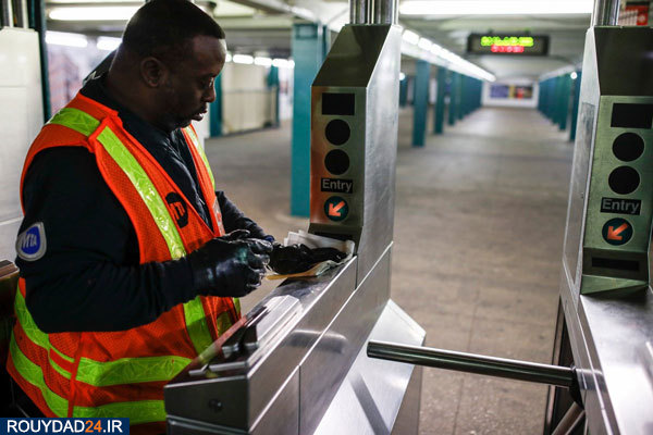 آمریکا ۲۷ مارس ۲۰۲۰، مسئول گیتهای ایستگاه مترو شهر نیویورک با رعایت اصول بهداشتی در پستش ایستاده است