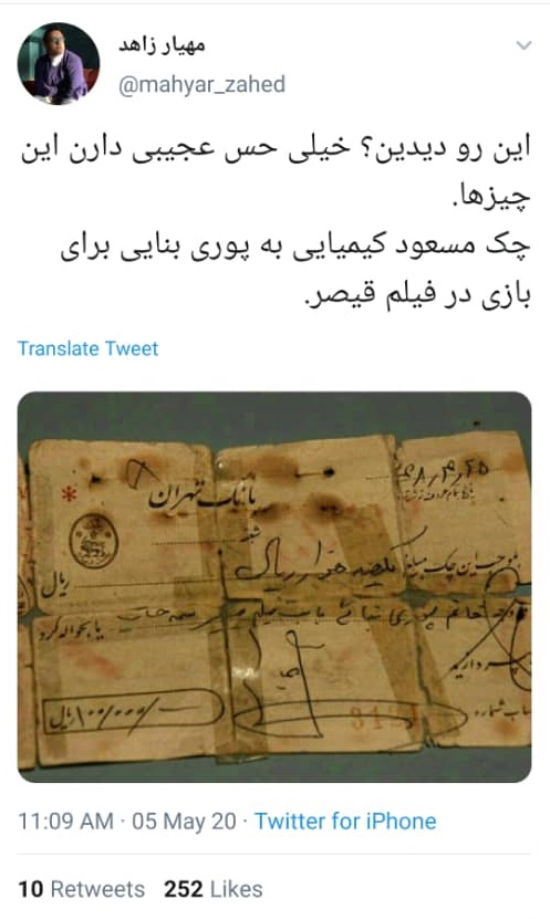 یکی از کاربران شبکه اجتماعی تصویری جالب از چک مسعود کیمیایی برای پوری بنایی بخاطر بازی در فیلم قیصر منتشر کرد.