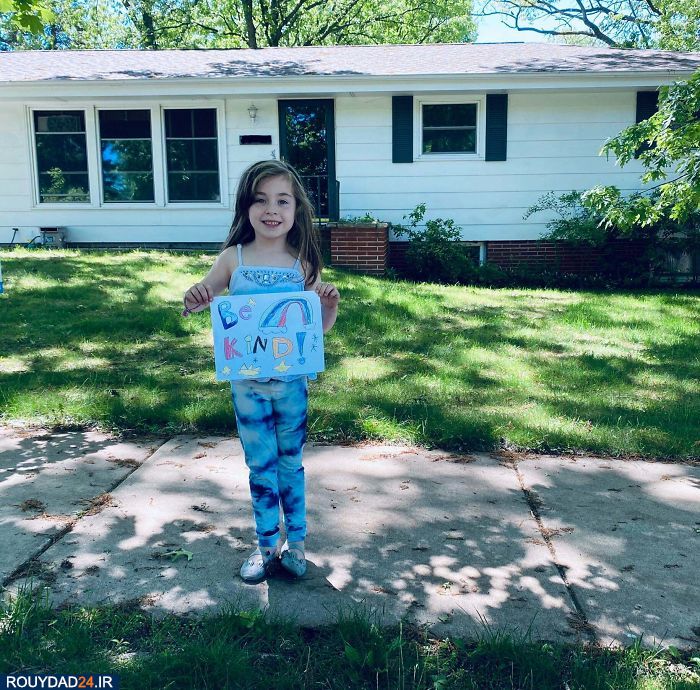 دختربچهای با شعار مهربان باشید، صلح و دوستی خود را نسبت به معترضان نشان میدهد