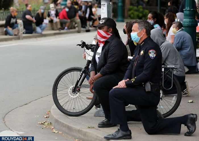 زانو زدن پلیسهای شهر سانتا کروز در کالیفرنیا به نشانه صلح با سیاهپوستان