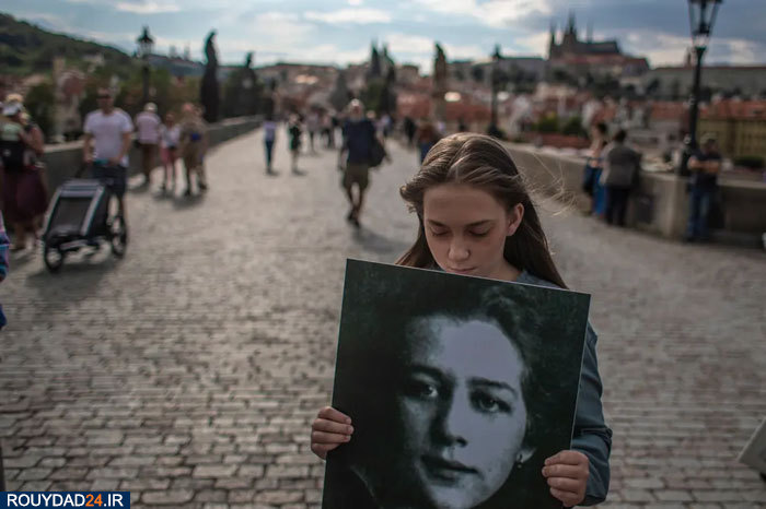 تصویر میلادا هوراکووا یکی از شجاعترین زنان و یک عضو پارلمان، و سیاست مدار اهل چکسلواکی در دستان دختری بر روی چارلزبریج در هفتادمین ساگرد اعدام این قانونگذار در شهر پرگ پایتخت چک