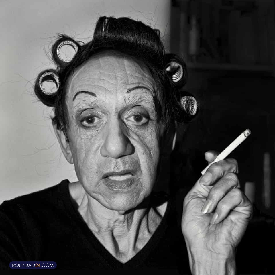 صحنه باز سازی شده اثر عکاسی دیان آربس به نام" زنی با بیگودی در خانه خیابان بیستم غربی نیویورک"، تصویر اصلی این صحنه مربوط به سال 1966 است