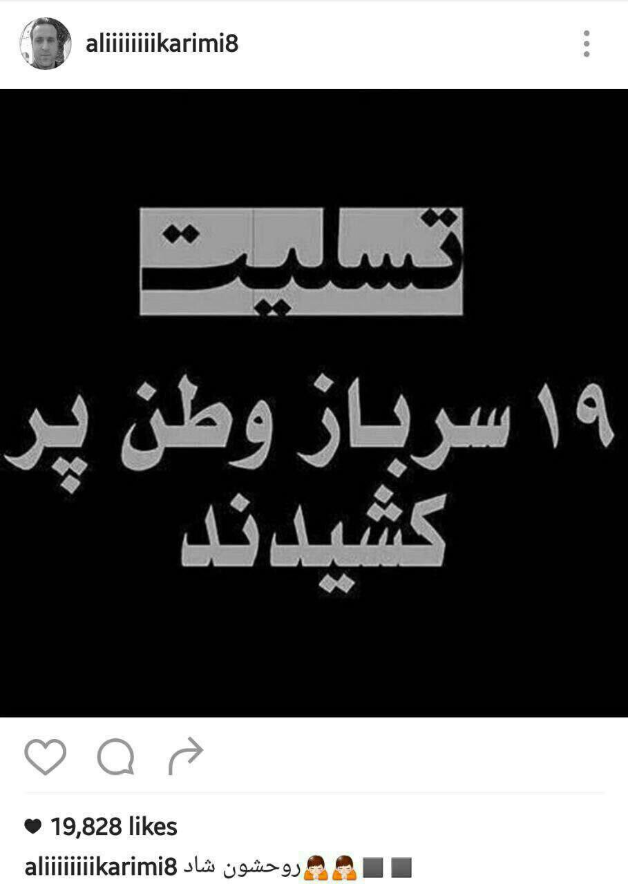علی کریمی، از فوتبالیست های با سابقه کشور در پی حادثه تصادف اتوبوس روز گذشته پیام تسلیت روز چهارشنبهی در صفحه اینستاگرام خود منتشر کرد.
