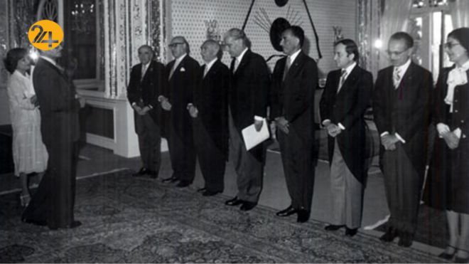 هویدا نخستوزیر در جمع میهمانان خارجی شرکت کننده در مراسم پنجاهمین سالروز دستور رضاشاه برای الغاء کاپیتولاسیون