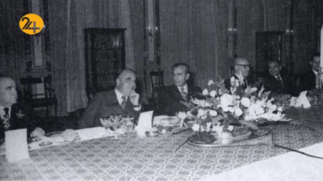ژرژ پمپیدو رئیس جمهور فرانسه در تهران. از چپ: هویدا، پمپیدو، محمدرضا پهلوی، شریفامامی و اسدالله علم