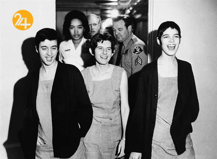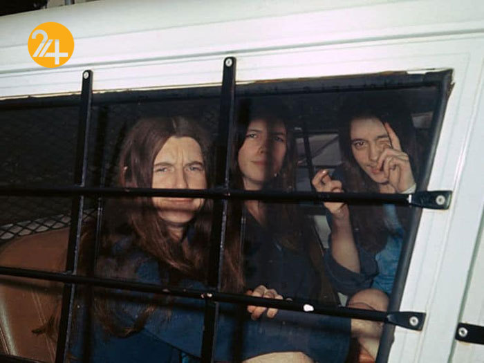خانواده منسن در راهروهای دادگاه به جرم قتل تیت و لابیانکا _ منسون در سال ۱۹۷۱ به خاطر قتل شرون تیت (همسر باردار رومن پولانسکی) و لنو و رزماری لابیانکا که توسط تعدادی از افراد خانوادهٔ منسون و به دستور شخص او انجام شد محاکمه شد