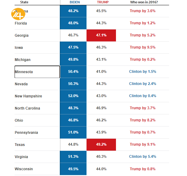به طور میانگین بایدن آرای ۵۲ تا ۵۳ درصد رای دهندگان را به خود اختصاص داده و با ۱۰ تا ۱۱ درصد اختلاف پیش افتاده. این آمار بی سابقهای در انتخاباتهای آمریکا در تنها ۲۳ روز مانده به روز انتخابات است.