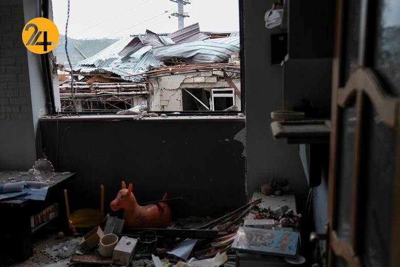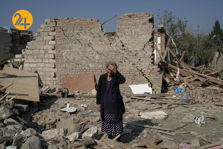 شهر گنجه در آذربایجان، زن 67 ساله در میان خانهای که توسط نیروهای ارمنستان با راکت مورد حمله قرار گرفته و ویران شده