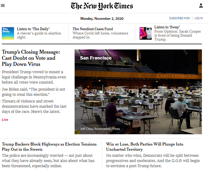 نیویورک تایمز نیز دیگر روزنامه معتبر آمریکایی نزدیک به حزب دموکرات است که صفحه اول خود را به گزارش لحظه به لحظه انتخابات اختصاص داده است. در گزارش زنده انتخابات تا این لحظه اظهارات ترامپ درمورد شکایت حقوقی ترامپ حتی قبل از شمارش آرا در پنسیلوانیا و اظهارات بایدن درباره احتمال تلاش ترامپ برای دزدیدن آرای انتخاباتی از اهمیت بالاتری برخوردار بوده است. این رسانه همچنین به احتمال بروز اعتراضات خیابانی و خشونت بعد از اعلام نتایج اشاره کرده است.