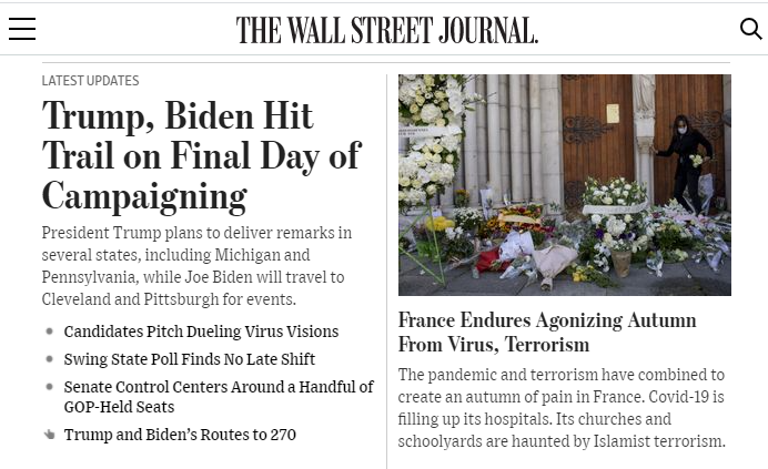 وال استریت ژورنال روزنامه نسبتا مستقل آمریکایی تیتر یک اخبار خود را یک شب مانده به انتخابات به گزارشهایی درباره رقابت ستادهای انتخاباتی ترامپ و بایدن در واپسین دقایق اختصاص داده است.