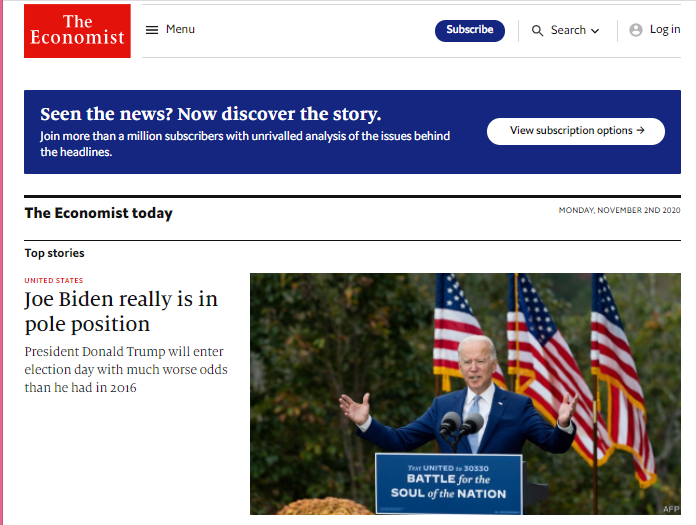 نشریه اکونومیست که به حزب دموکرات نزدیک است نیز در گزارش صفحه یک دوم نوامبر خود پیشروی بایدن در نظرسنجیها اشاره کرده و نوشت: این انتخابات قرار است تاریخی شود. این انتخابات حوادث ناشناخته زیادی به دنبال خواهد داشت، اما هیچ کدام از این جریانها تاثیری بر رای دهندگان نگذاشته و در شش ماه اخیر همواره بایدن در راس نظرسنجیها بوده است.