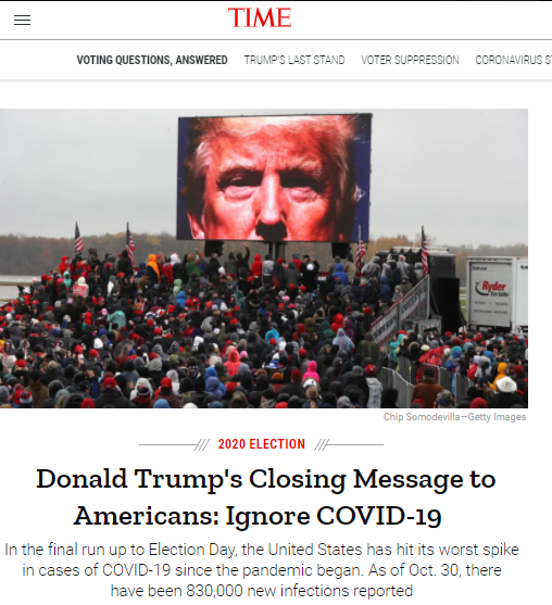 نشریه تایم (نزدیک به دموکراتها) گزارش اول خود را به اظهارات ترامپ درباره ویروس کرونا و نادیده گرفتن خطرات این ویروس در روزهای اول و ادعای او درباره تولید واکسن در روزهای آتی اختصاص داده است.