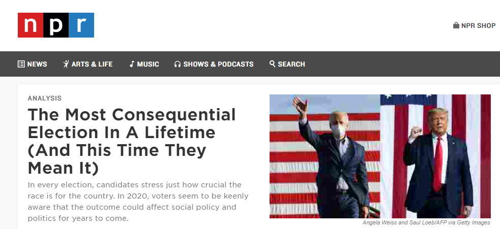 نشریه اینترنتی نیویورکر که از لحاظ گرایش حزبی به دموکراتها نزدیک است، در صفحه اول گزارشی با عنوان «جو بایدن سعی دارد انتخابات را به یک رفراندوم اخلاقی تبدیل کند» منتشر کرده است. این نشریه گزارشهای انتخاباتی دیگری منتشر کرده و توضیح داده چرا ترامپ نمیتواند شکست را تحمل کند.