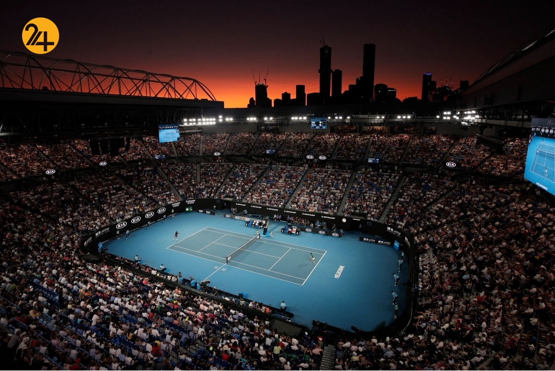 راجر فدرر سوئیسی و نواک ج کوویچ صربستانی دو تنیس باز حرفه ای جهان در بازی مرحله نیمه نهایی در ورزشگاه رو باز ملبورن استرالیا
