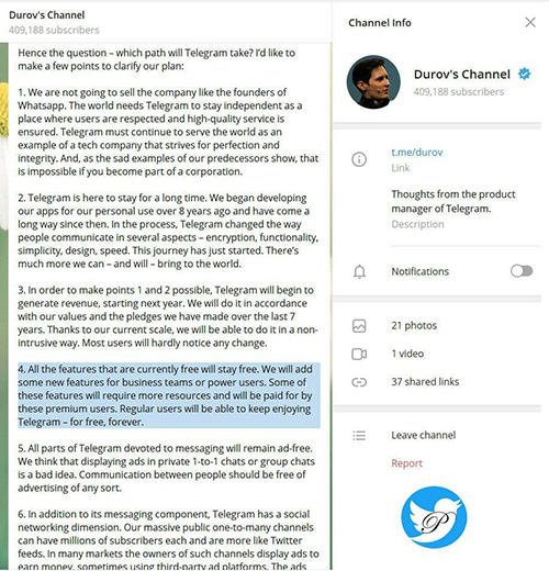 پاول دوروف با انتشار خبر عبور از ۵۰۰میلیون کاربر نوشت از سال آینده برخی از سرویسهای جدید تلگرام پولی خواهد شد.