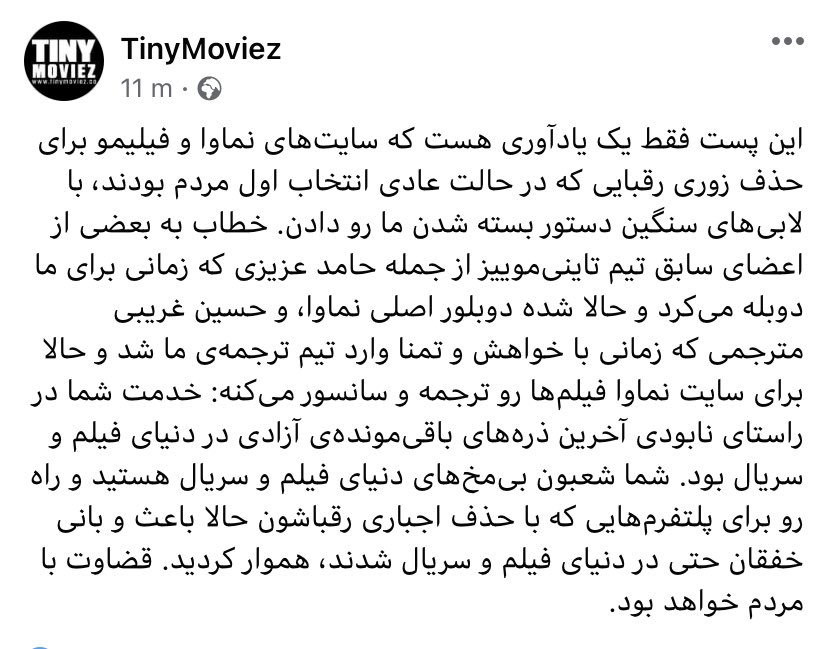 وبسایت تاینی موویز، یکی از معروفترین وبسایتهای دانلود فیلم، اخیرا پستی در صفحه فیس بوک خود منتشر کرده و ضمن یادآوری این واقعه گفته: «سایتهای نماوا و فیلیمو برای حذف زوری رقبایی که در حالت عادی انتخاب اول مردم بودند، با لابیهای سنگین دستور بسته شدن ما را دادند.»