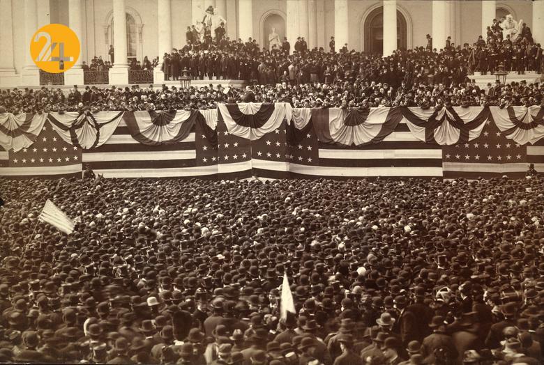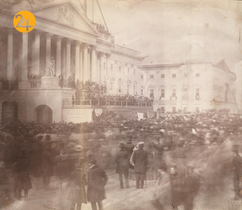 سال ۱۸۶۵ مراسم تحلیف آبراهام لینکلن د کاخ کنگره در یک روز بارانی. در این تصویر گروههای آفریقایی و آمریکایی که در حال رژه رفتن هستند دیده میشوند. او سه ماه بعد از تحلیف در ۱۵ آوریل در سن ۵۶ سالگی ترور شد. او کسی بود که به تاریخ بردهداری در آمریکا خاتمه داد و ایالات متحده آمریکا را با نظارت بر مسائل مربوط به جنگ در دوران جنگ داخلی آمریکا پابرجا نگه داشت