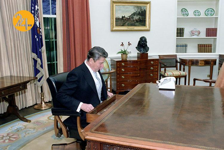 ژانویه سال ۱۹۸۱ رونالد ریگان در روز تحلیف. او در دفتر بیضوی یا دفتر خاگدیس که نام دفتر و محل کار رئیسجمهور ایالات متحده آمریکاست نشسته است
