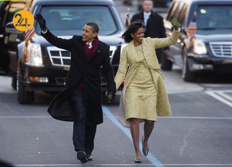 روز ۲۰ ژانویه ۲۰۰۹ باراک اوباما و میشل اوباما در مراسم تحلیف ریاست جمهوری درحالیکه در مراسم رژه تحلیف در خیابان پنسیلوانیای واشنگتن راه میروند و برای حضار دست تکان میدهند
