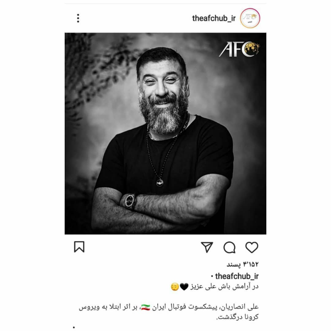ورزشی » برگزیده کد خبر: ۲۵۰۳۰۲ تاریخ انتشار: ۱۷:۱۹ - ۱۵ بهمن ۱۳۹۹ واکنش اینستاگرامی صفحه فارسی afc علی انصاریان مدافع سابق تیم ملی فوتبال ایران در اثر تشدید درگیری ریهاش به خاطر ویروس کرونا، جان به جان آفرین تسلیم کرد.