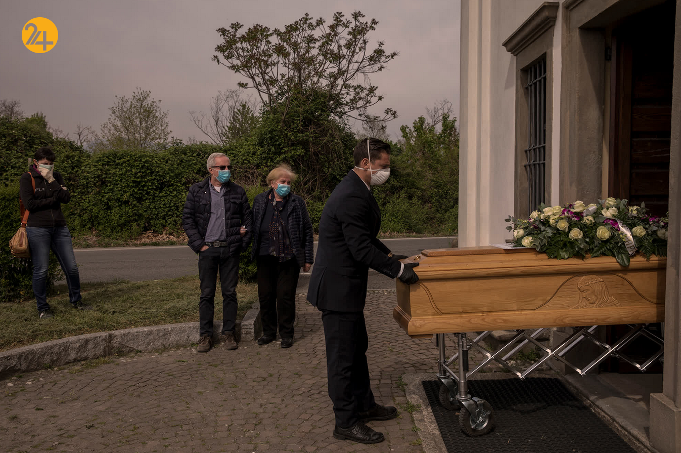 شهر میلان ایتالیا، انعکاس چهره زنی که با تابوت یک کرونایی نگاه میکند