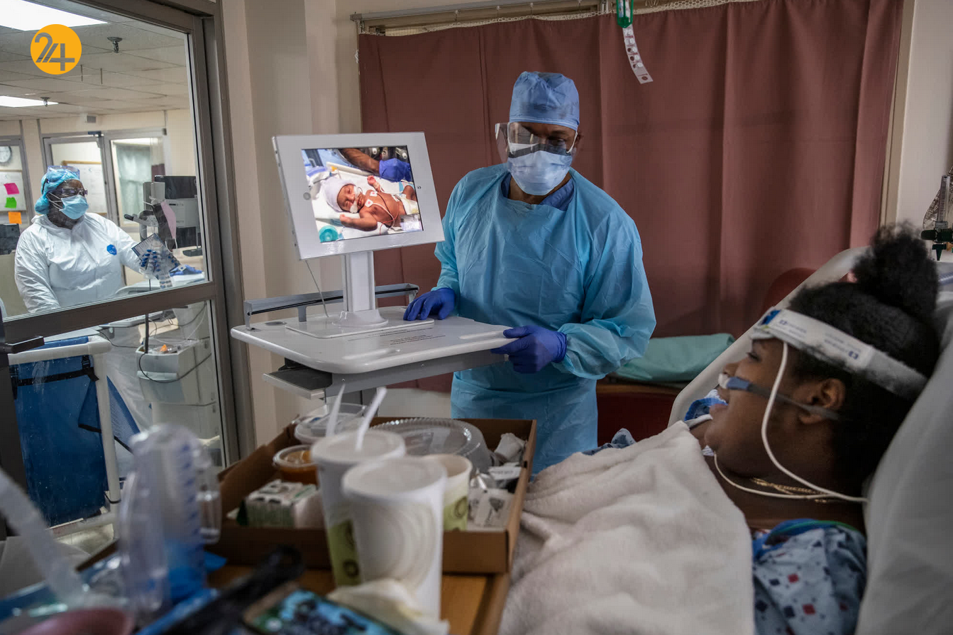 دکتری در مرکز درمانی بروکلین در نیویورک بر بالین مادری که به ویروس کرونا مبتلا شده است.