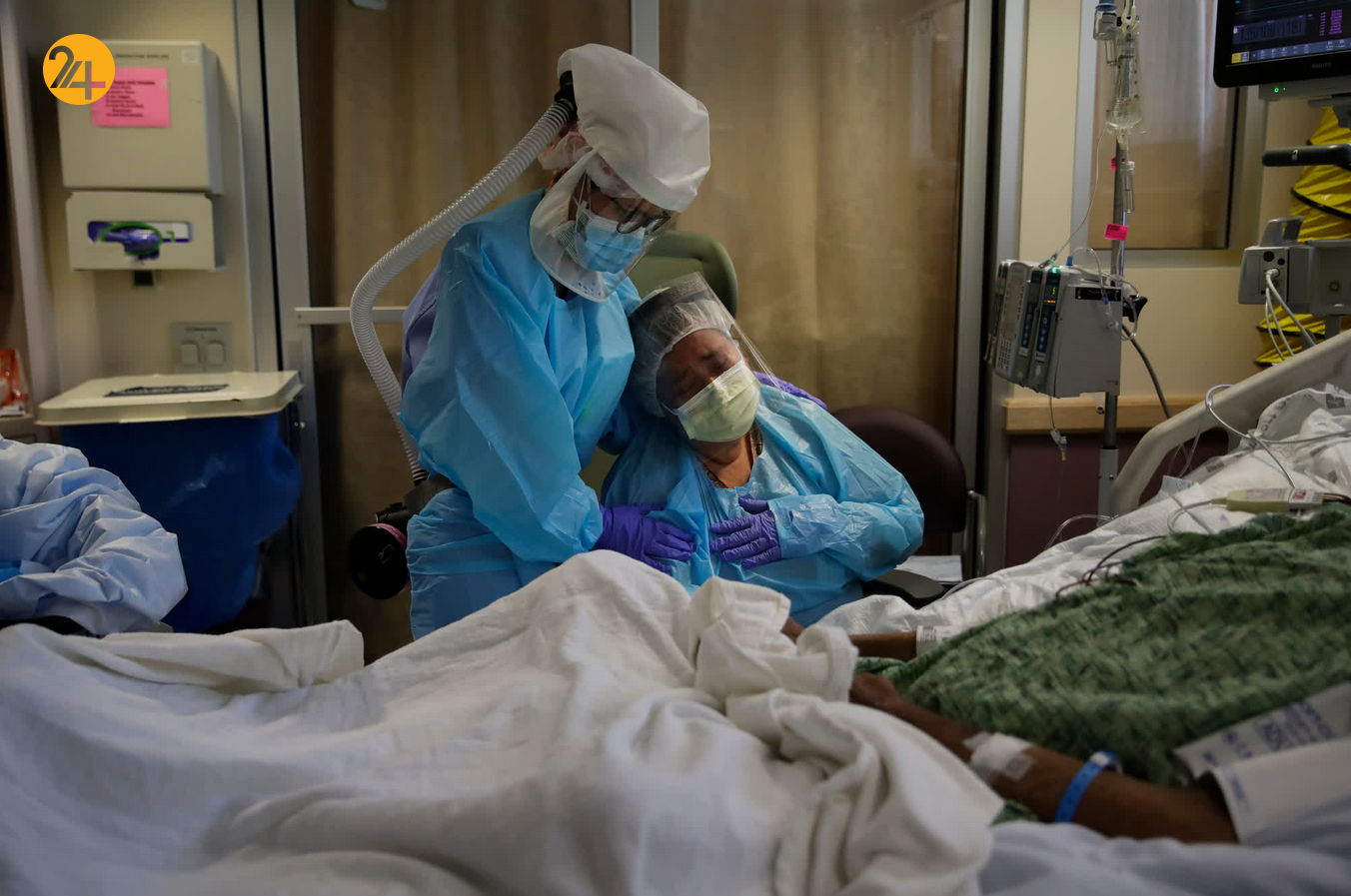 زنی در بیمارستانی در کالیفرنیا در کنار جسد همسرش که دقایقی است که در اثر ابتلا به کرونا از دنیا رفته است و پرستار بیمارستان درحال تسکین اوست