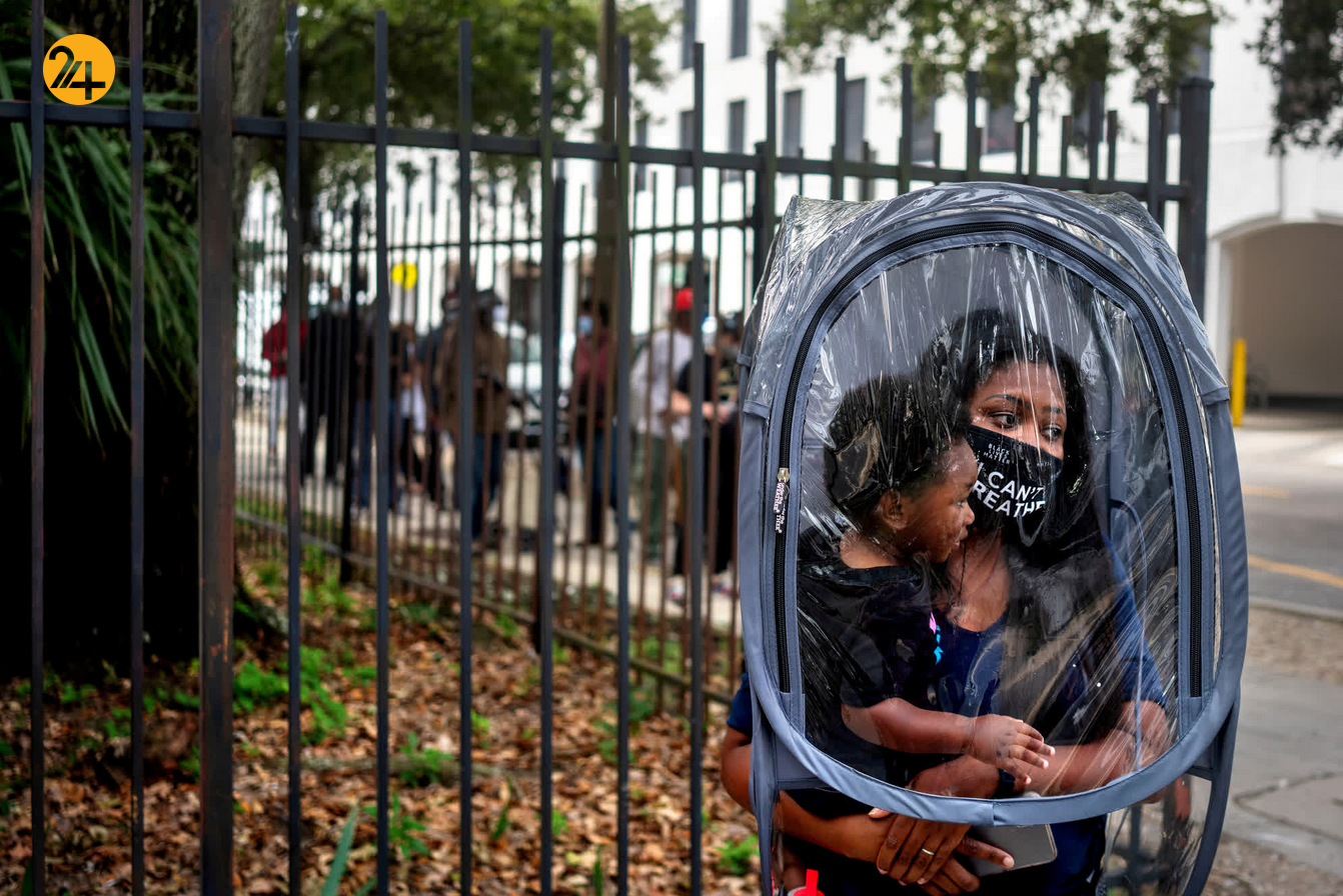 دانا کلارک و پسر ۱۸ ماههاش با رعایت پروتکلهای اجتماعی در صف رای گیری انتخابات ریاست جمهوری ۲۰۲۰ آمریکا در نیواورلئان
