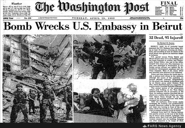 رویداد۲۴ انفجار سفارت ایالات متحده بمبگذاری در ۱۸ آوریل ۱۹۸۳ یا 22 فروردین سال 1361 یک بمبگذاری انتحاری در بیروت، لبنان بود که به کشته شدن ۶۳ نفر از جمله ۱۷ نفر آمریکایی انجامید. قربانیان اکثراً اعضای سفارت و سیا بودند، اما همچنین شامل چندین سرباز آمریکایی و یک نگهبان وابسته به تفنگداران دریایی آمریکا (گارد امنیتی دریایی) میشد.