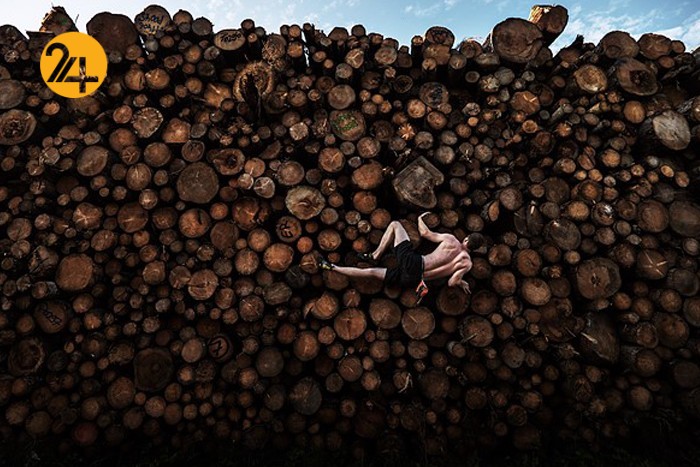 کسب رتبه اول در بخش ورزشی (یک صخرهنورد در ایالت بایرن آلمان به جای صخره و سنگ به تنههای درختان انبارشده آویزان است.) عکاس: آدام پرتی از استرالیا(getty images)