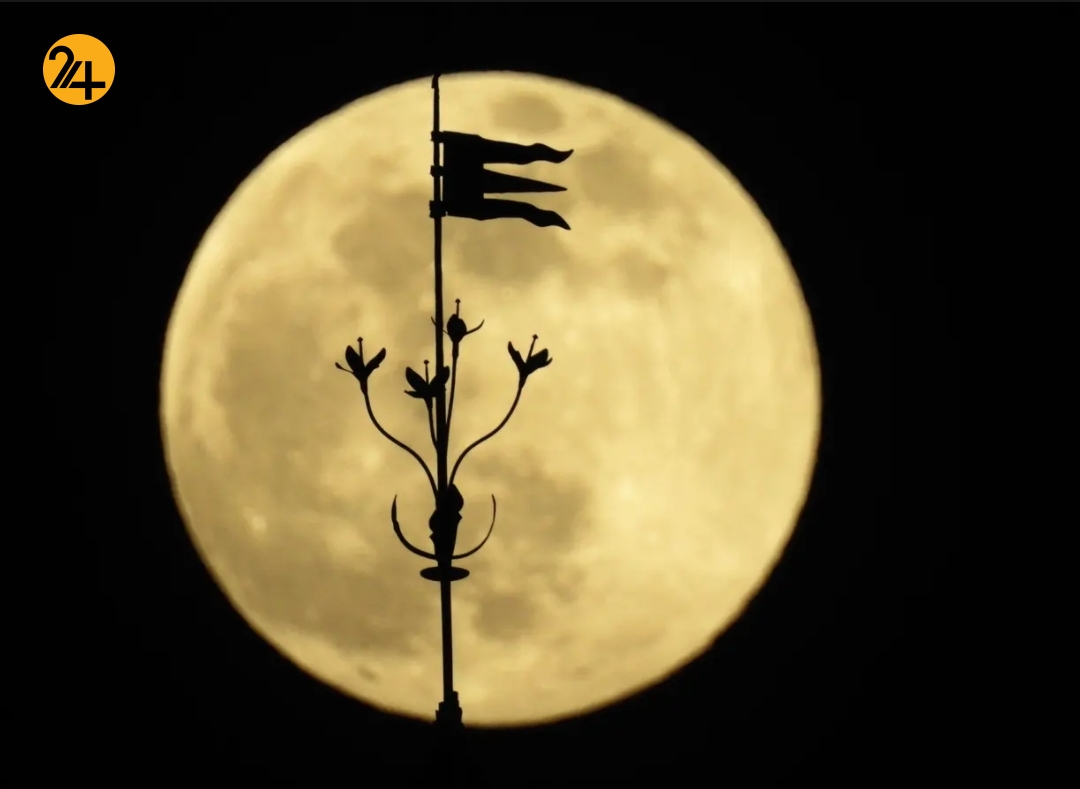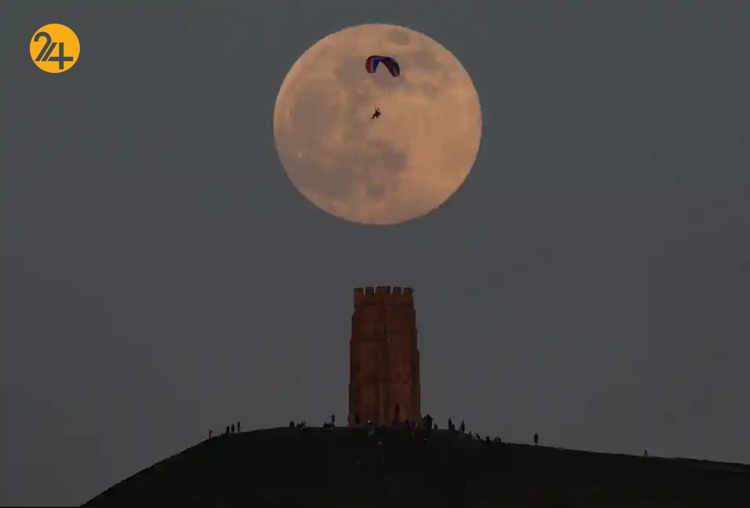 ابرماه پشت  تپه گلاستون‌بری تور در سامرست انگلستان. برج بی‌سقف سنت مایکل کنار ابرماه خودنمایی می‌کند. برج سنت مایکل، باقیمانده کلیسایی قدیمی مربوط به قرن دوازدهم میلادی است که در زلزله ۱۱ سپتامبر ۱۲۷۵ ویران شد. عکاس : Finnbarr Webster/Getty Images