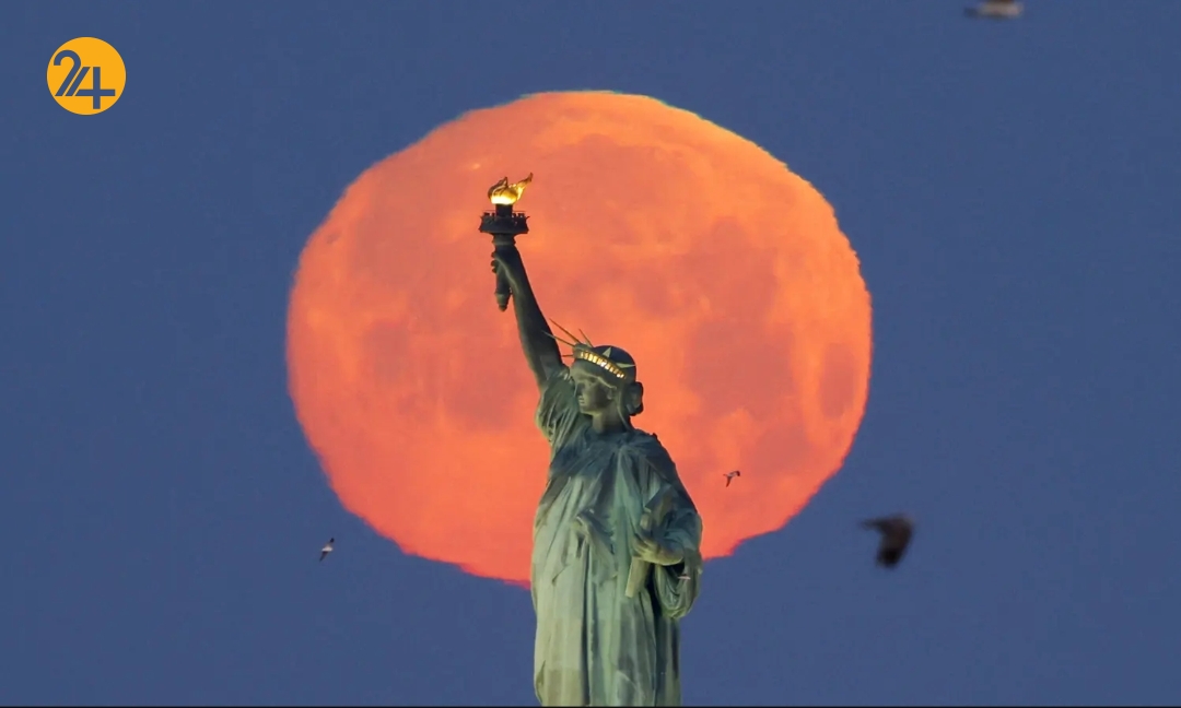 ابرماه صورتی در پس مجسمه آزادی در شهر نیویورک عکاس; john Angelillo