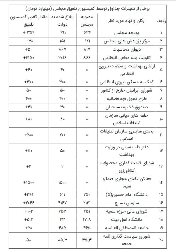 ایرنا همچنین نوشته است: "بدون شک تغییرات اعمال شده بیش از این بوده و گفته میشود که کمیسیون تلفیق، بودجه برخی نهادهای دولتی را بهطور کلی حذف کرده است. برای مثال اعتبار ۵۰ میلیارد تومانی سازمان برنامه و بودجه برای اصلاح ساختار بودجه نیز توسط مجلس خط خورده است. "