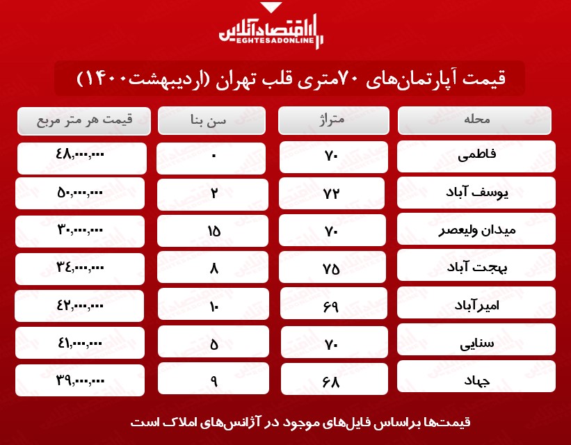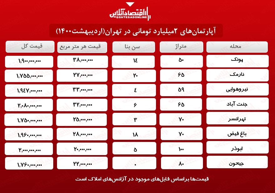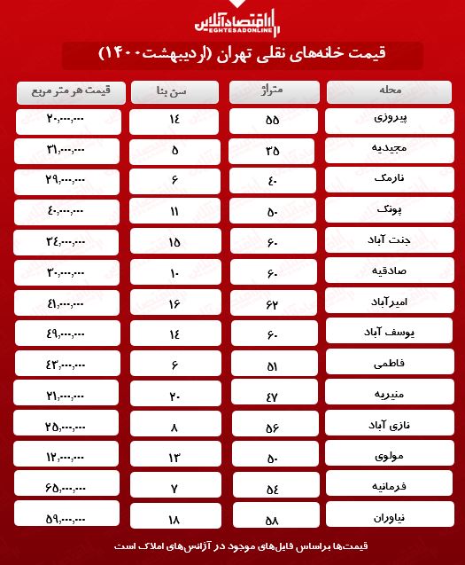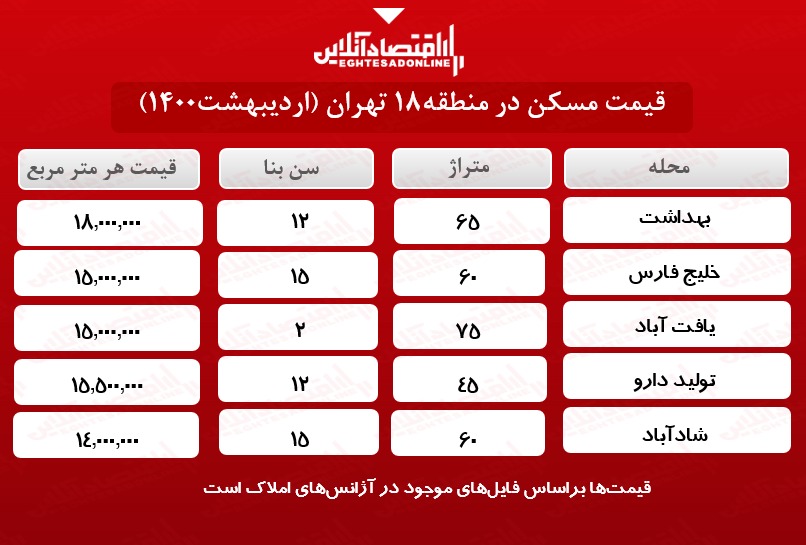 هر متر مربع یک دستگاه واحد مسکونی ۸۰ متری با عمر بنای ۵ سال، واقع در منطقه تهرانپارس به مبلغ ۳۲ میلیون تومان در بازار به فروش می‌رسد.